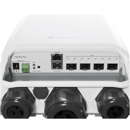 This rugged outdoor switch is perfect for connecting mast devices. Like the mANTBox 52 or the LHG XL 52. Imagine a huge campsite with several guest houses, a food court, and the owner’s cabin. You can connect all the locations with the FiberBox Plus. One of the fiber connections can be used for the mANTBox base station – to provide general connectivity for the guests. Another connection could go to the owner’s house. And the third could be used in the food court – to connect their payment and inventory servers.