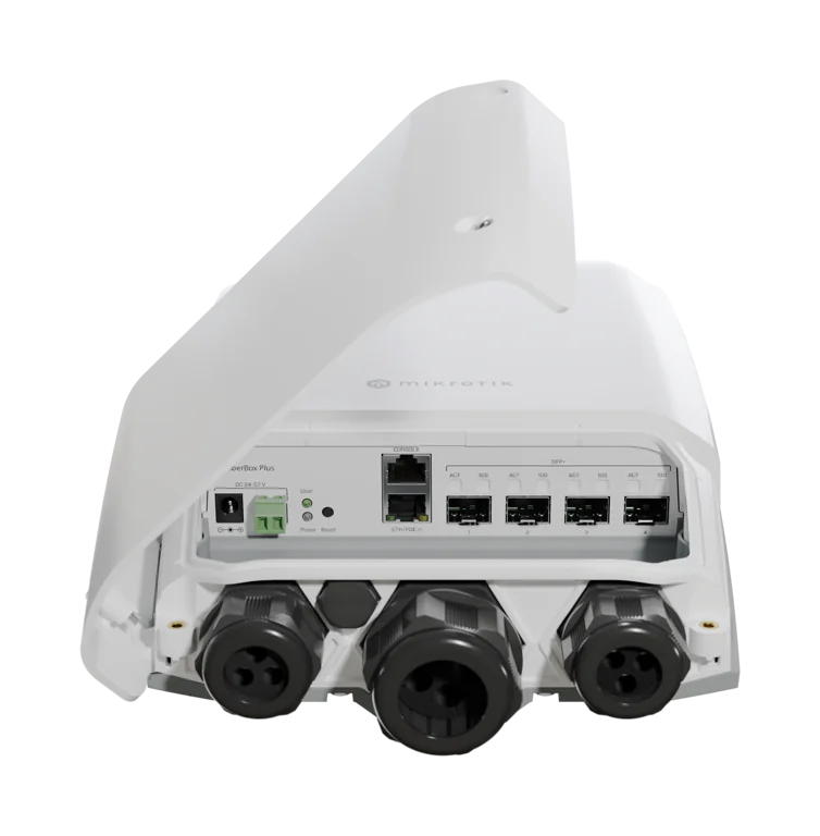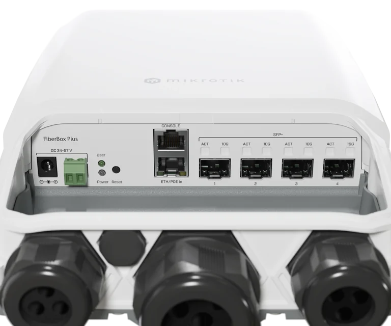 This rugged outdoor switch is perfect for connecting mast devices. Like the mANTBox 52 or the LHG XL 52. Imagine a huge campsite with several guest houses, a food court, and the owner’s cabin. You can connect all the locations with the FiberBox Plus. One of the fiber connections can be used for the mANTBox base station – to provide general connectivity for the guests. Another connection could go to the owner’s house. And the third could be used in the food court – to connect their payment and inventory servers.