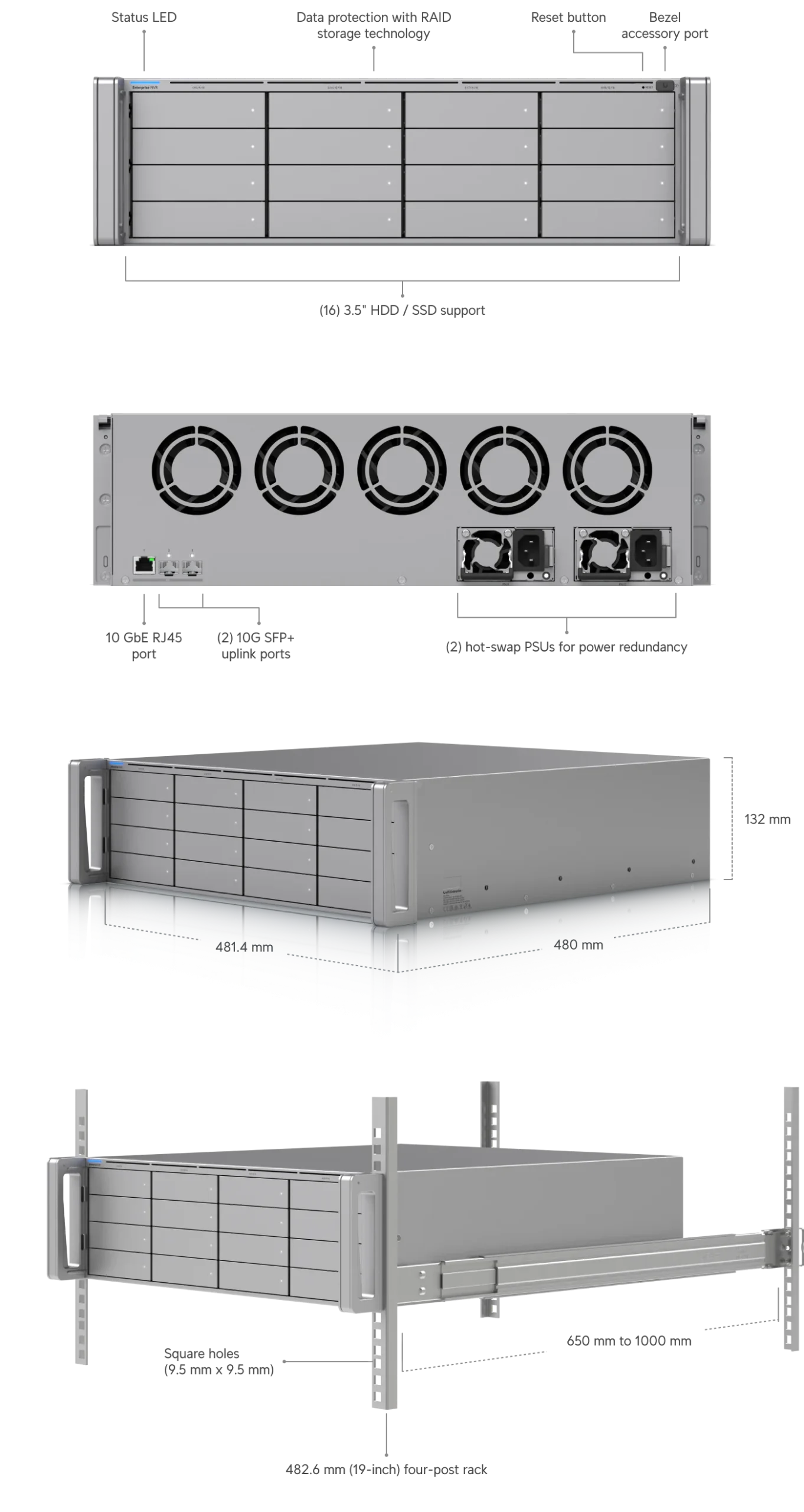 3U NVR with (16) 2.5/3.5” drive bays, supporting up to (70) 4K cameras or (210) Full HD cameras.